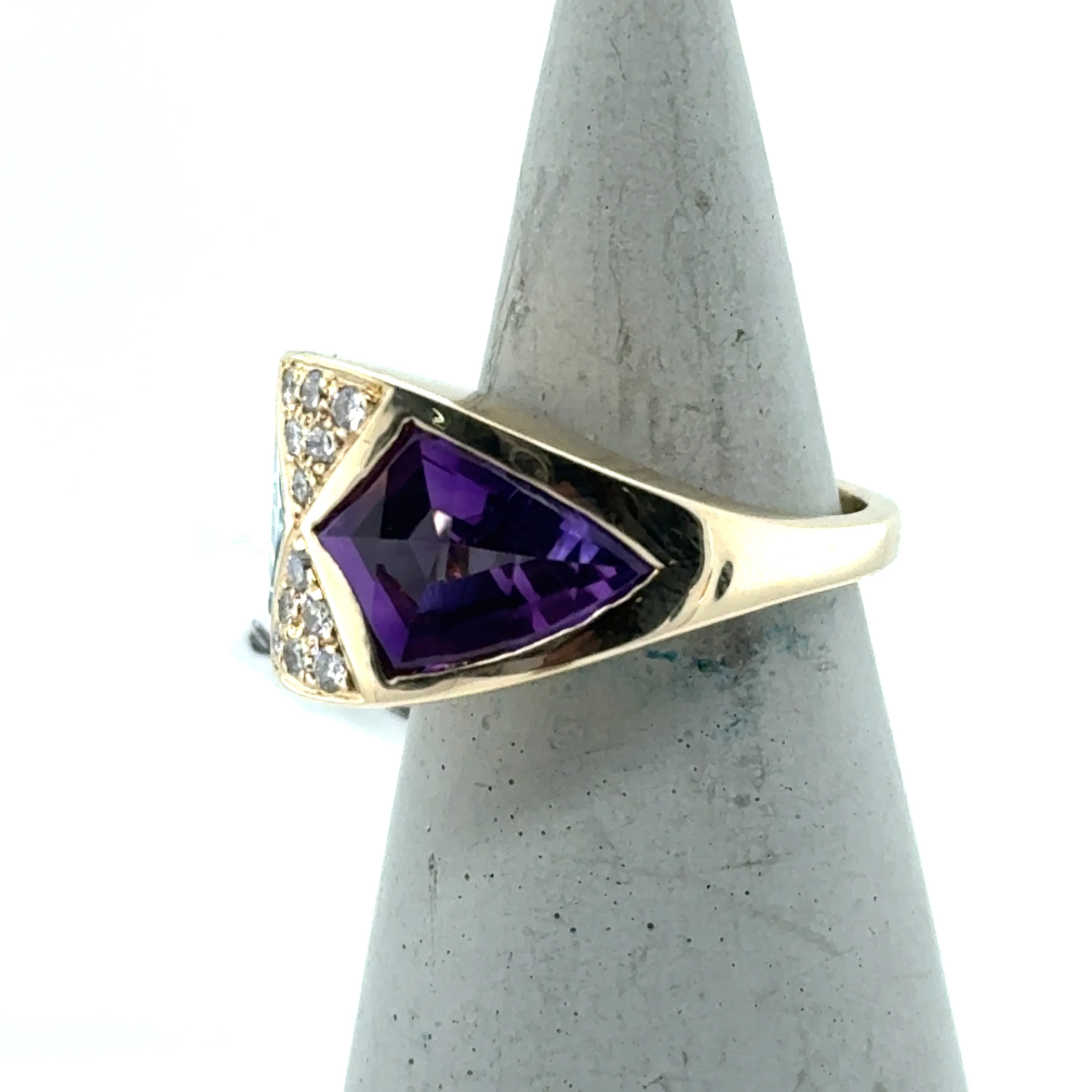14K yellow gold amethyst, blue topaz and diamond ring. This uniquely cool ring contains one fantasy cut sky blue topaz and one fantasy cut amethyst. Each of these stones measures approx 13.5x10.0mm, and is bezel set. Set between these two stones are 12 round brilliant-cut natural diamonds, approx 0.24ctw, I-color, SI1-clarity. The ring measures approximately 13.0mm at the top and tapers to 2.5mm at the base of the shank. Size 6. 11.6 grams.