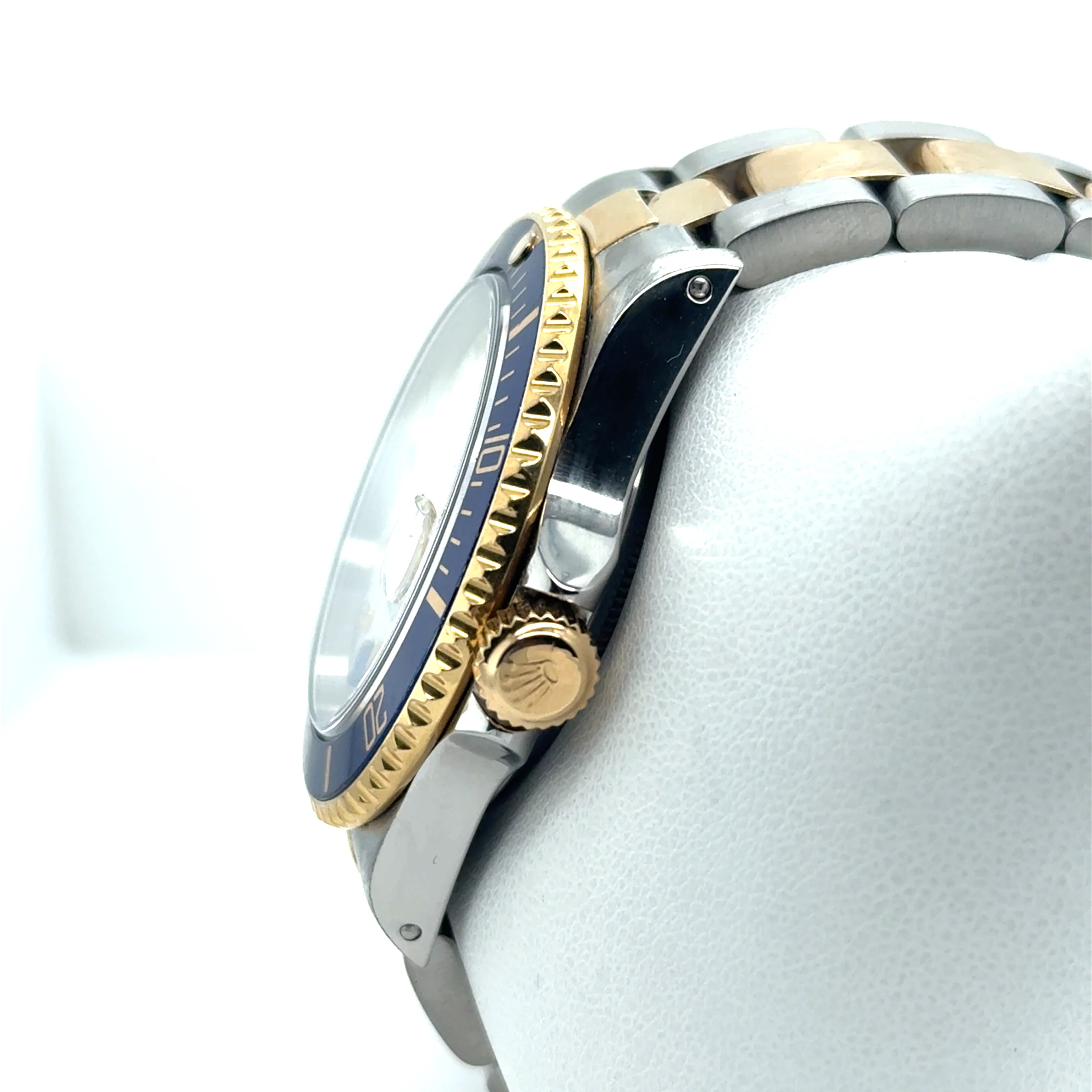 This exceptional timepiece boasts a 40mm stainless steel case, with a mother of pearl sapphire Serti dial with sapphires at the 6, 9 and 12 o’clock positions, and blue aluminum bezel insert. With a magnified date display at 3 o’clock, and Tritium hour markers and hands, and a unidirectional 60-minute graduated fluted bezel in 18K yellow gold. The aluminum bezel insert is showing signs of wear, as shown in the photos.