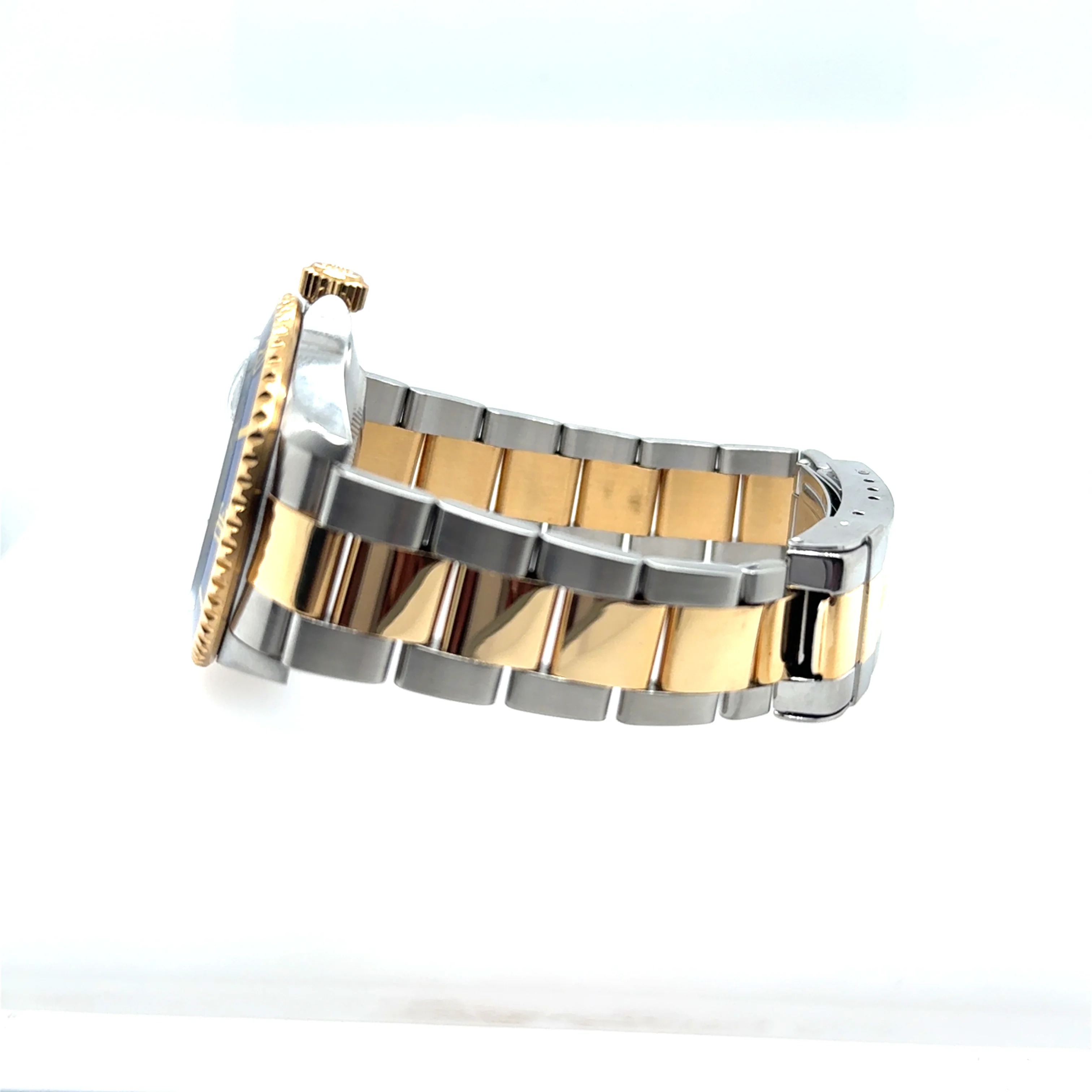 The watch bracelet is stainless steel and 18K gold. The Fliplock clasp has micro adjustments that ensures a comfortable fit. This watch has all 11 links