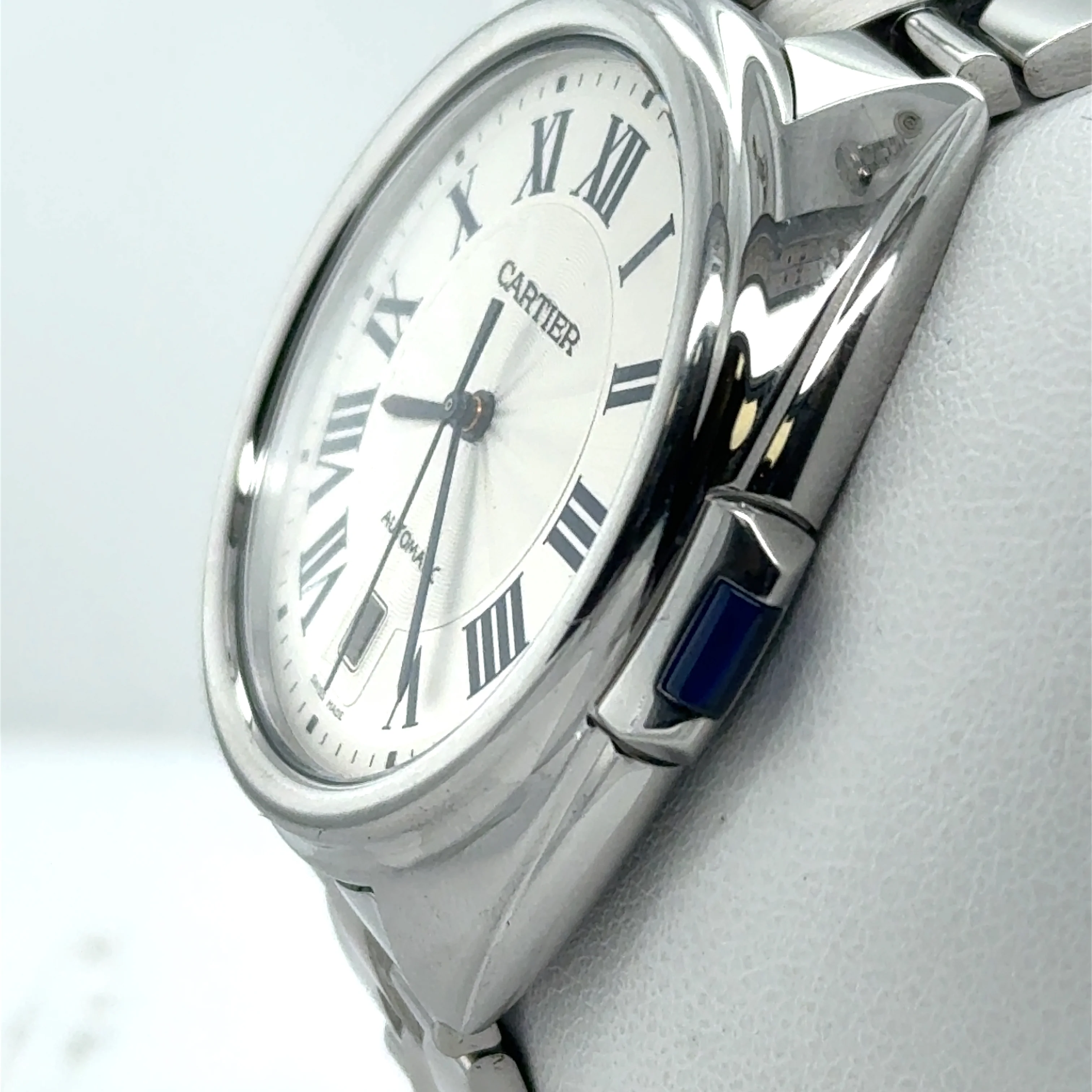 Cartier Cle de Cartier 40mm stainless steel wristwatch. Featuring a sleek and refined 40mm case, with a smooth bezel.